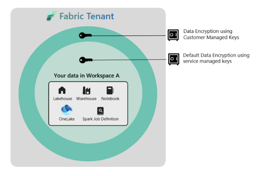 Microsoft Fabric versleutelt standaard alle data‑at‑rest met door Microsoft beheerde sleutels. Deze baseline voldoet aan frameworks zoals GDPR, ISO‑27001, SOC‑normeringen en HIPAA.